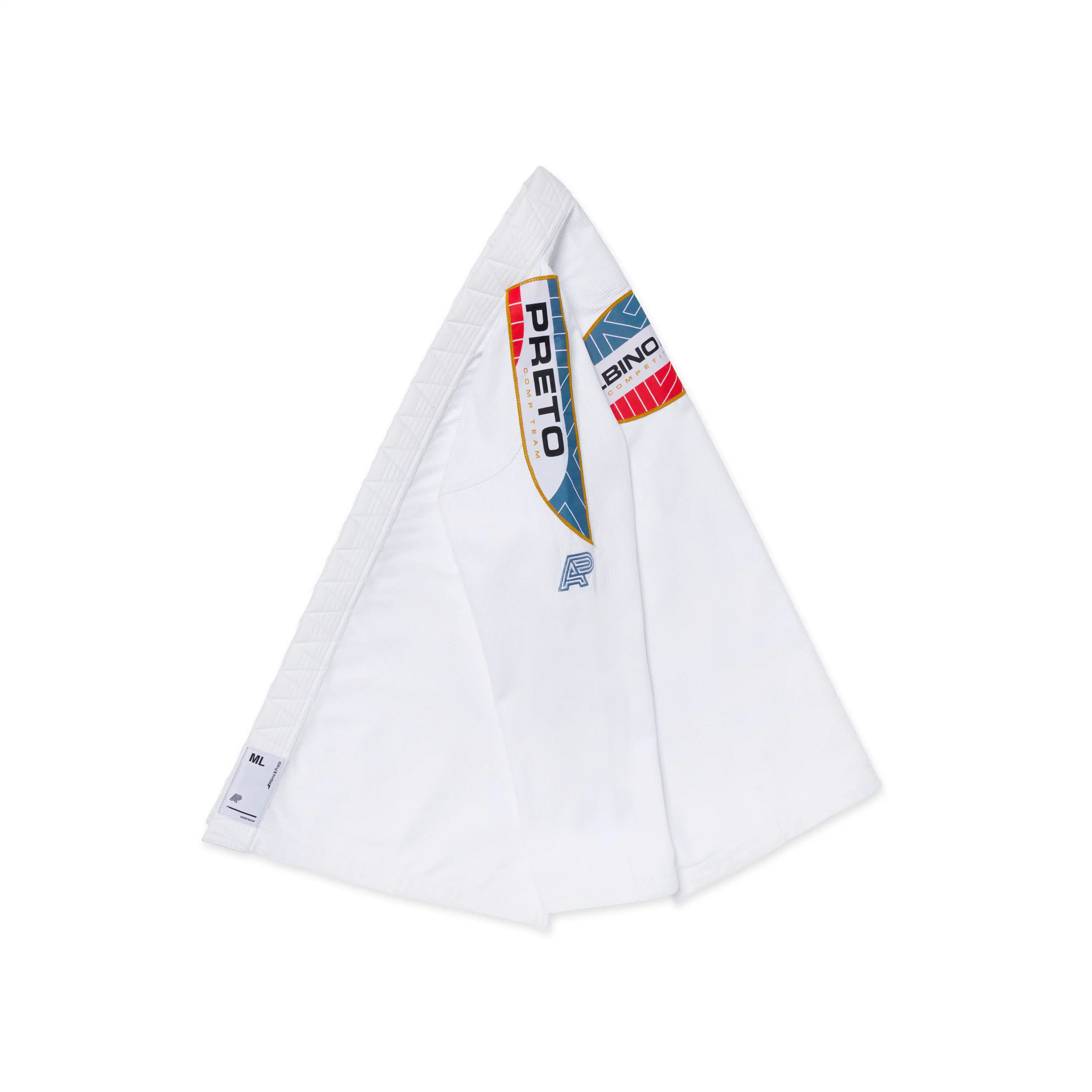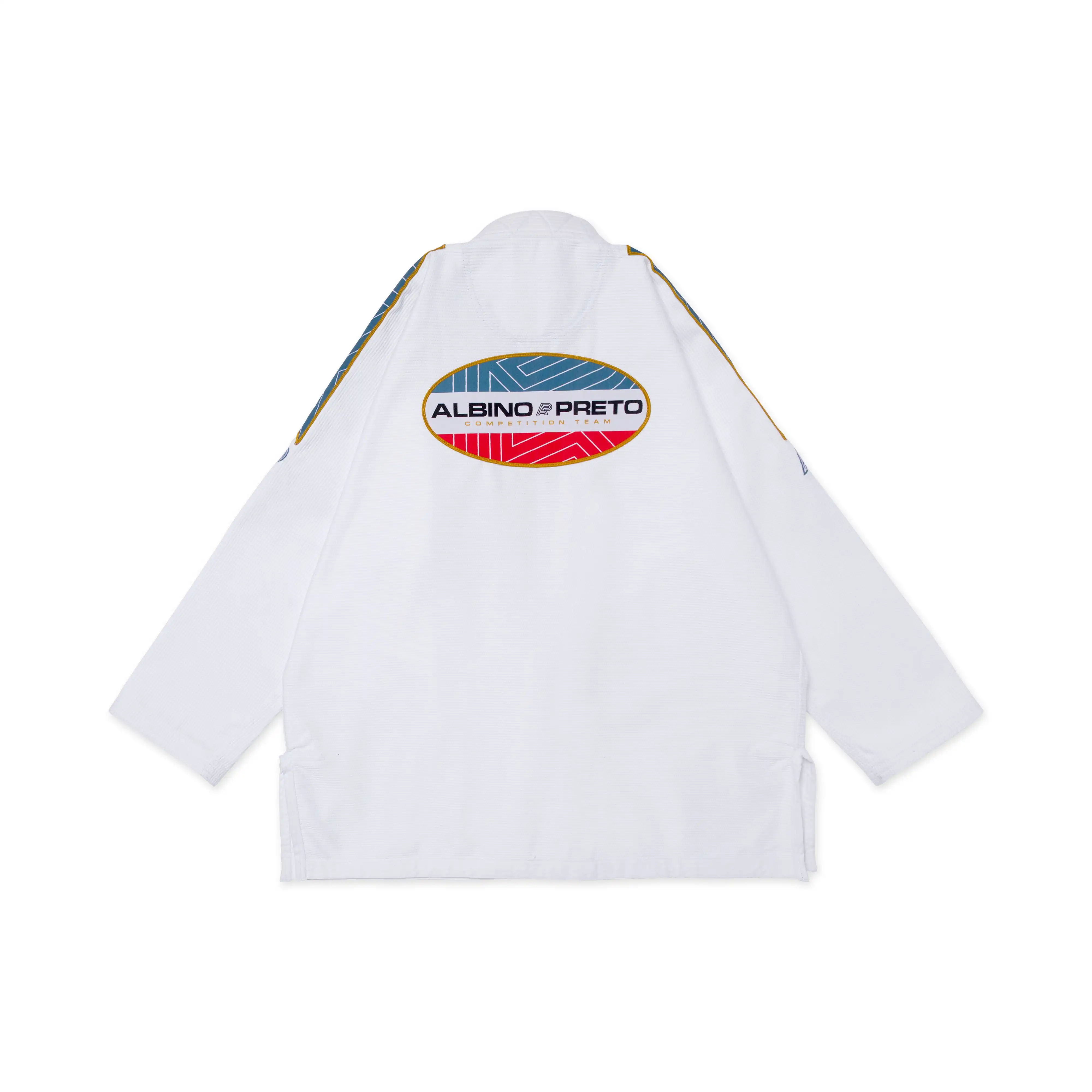 The Albino & Preto BRG Comp BJJ Gi White – 380GSM, IBJJF Approved pairs clean tailoring with statement embroidery. On a crisp white base, the blue, red, and gold (BRG) accents add confident personality without shouting—perfect for mats where minimal, competition-legal branding matters. Stitch density is dialed for clarity and durability, so logos stay sharp after hard rounds and repeated washes. Together with the MN001 pattern and 380GSM pearl weave top, the embroidery elevates a performance-first kimono into a piece athletes are proud to wear on comp day and during everyday training. Choose your size, add to cart, and bring color to your game.