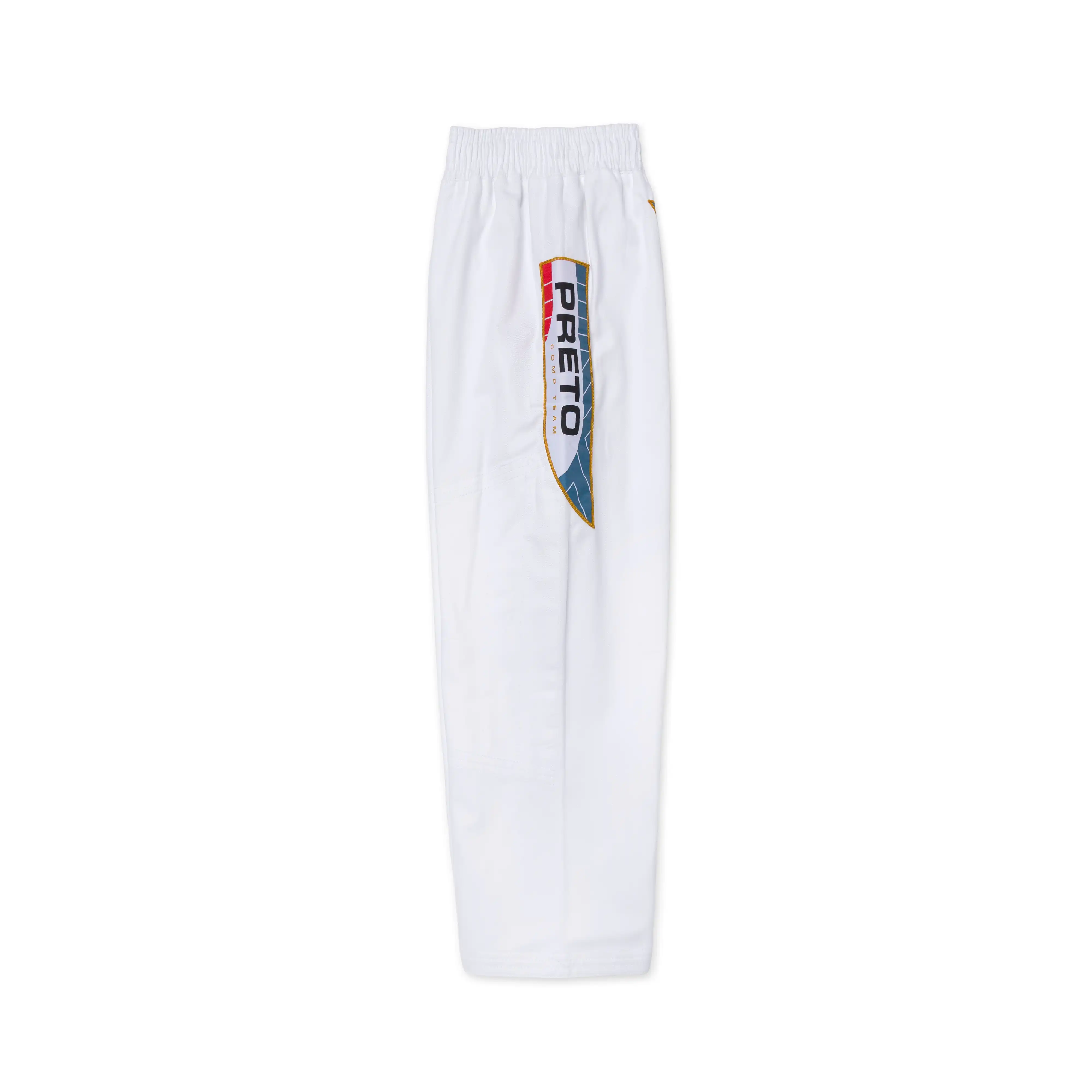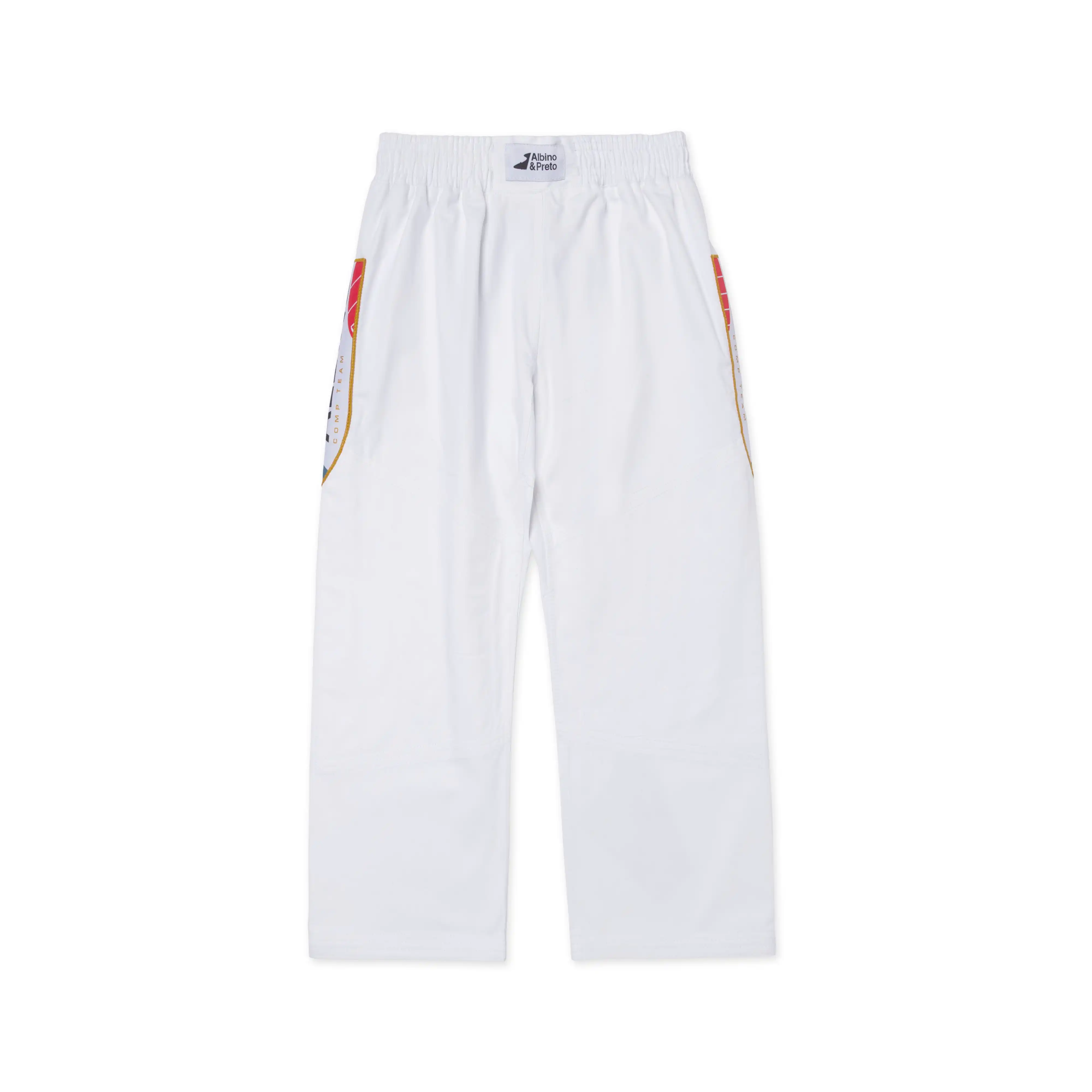 The Albino & Preto BRG Comp BJJ Gi White – 380GSM, IBJJF Approved pairs its standout jacket with competition-ready pants designed for comfort and control. The trousers use a 10oz cotton weave that feels soft against the skin yet holds up to hard drilling. A Full Elastic Pants (FEP) waistband teams with a flat drawcord featuring sleek waxed tips to lock in a stay-put fit through scrambles, takedowns, and guard work. Built for the mat and designed for champions—choose your size, add to cart, and roll with confidence.