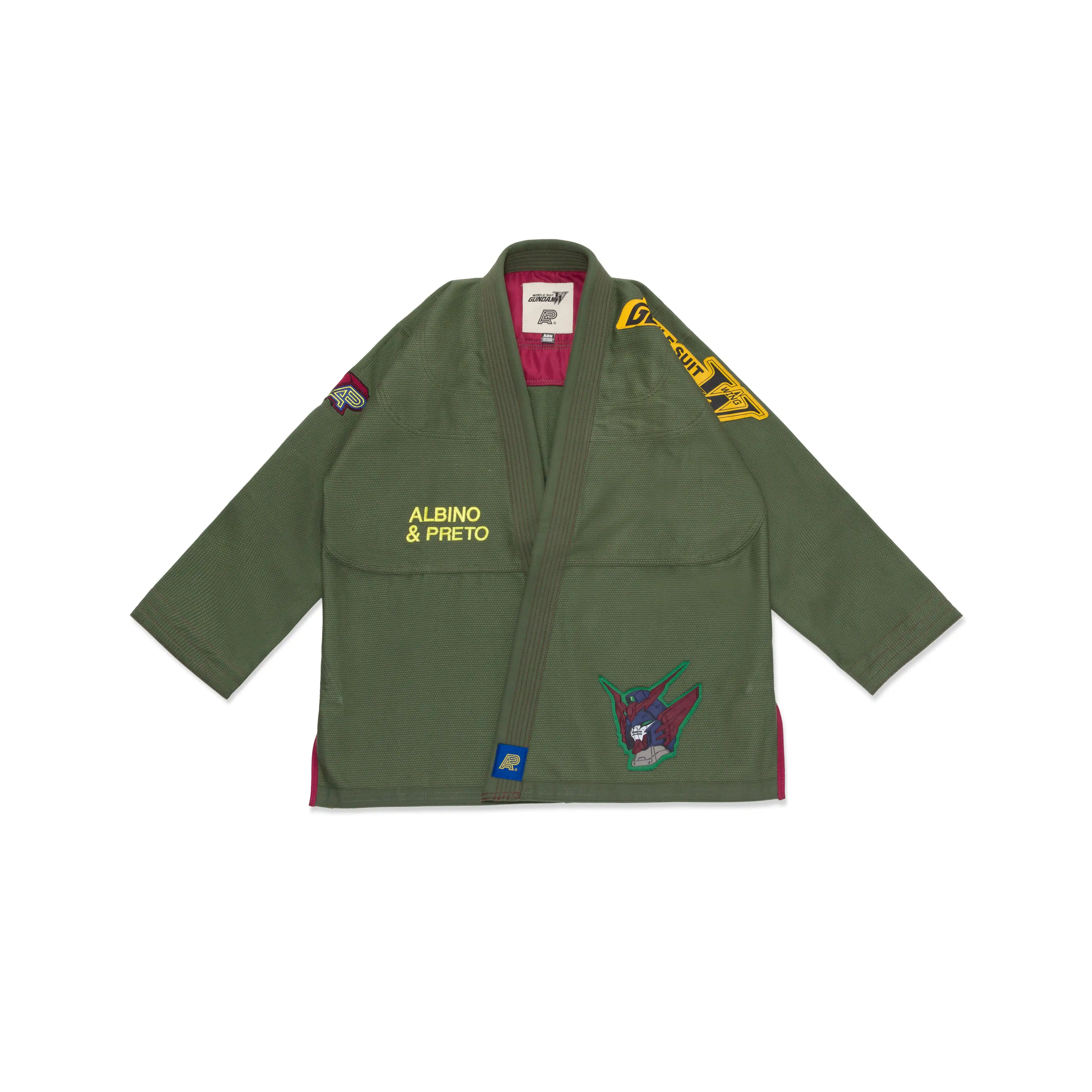 With a unique fusion of martial arts and Mobile Suit Gundam Wing aesthetics, the kimono features Gundam Wing iconography, including embroidered patches on the chest and back. The A&P mark on the right sleeve adds a distinct touch of branding, making it a standout piece. -