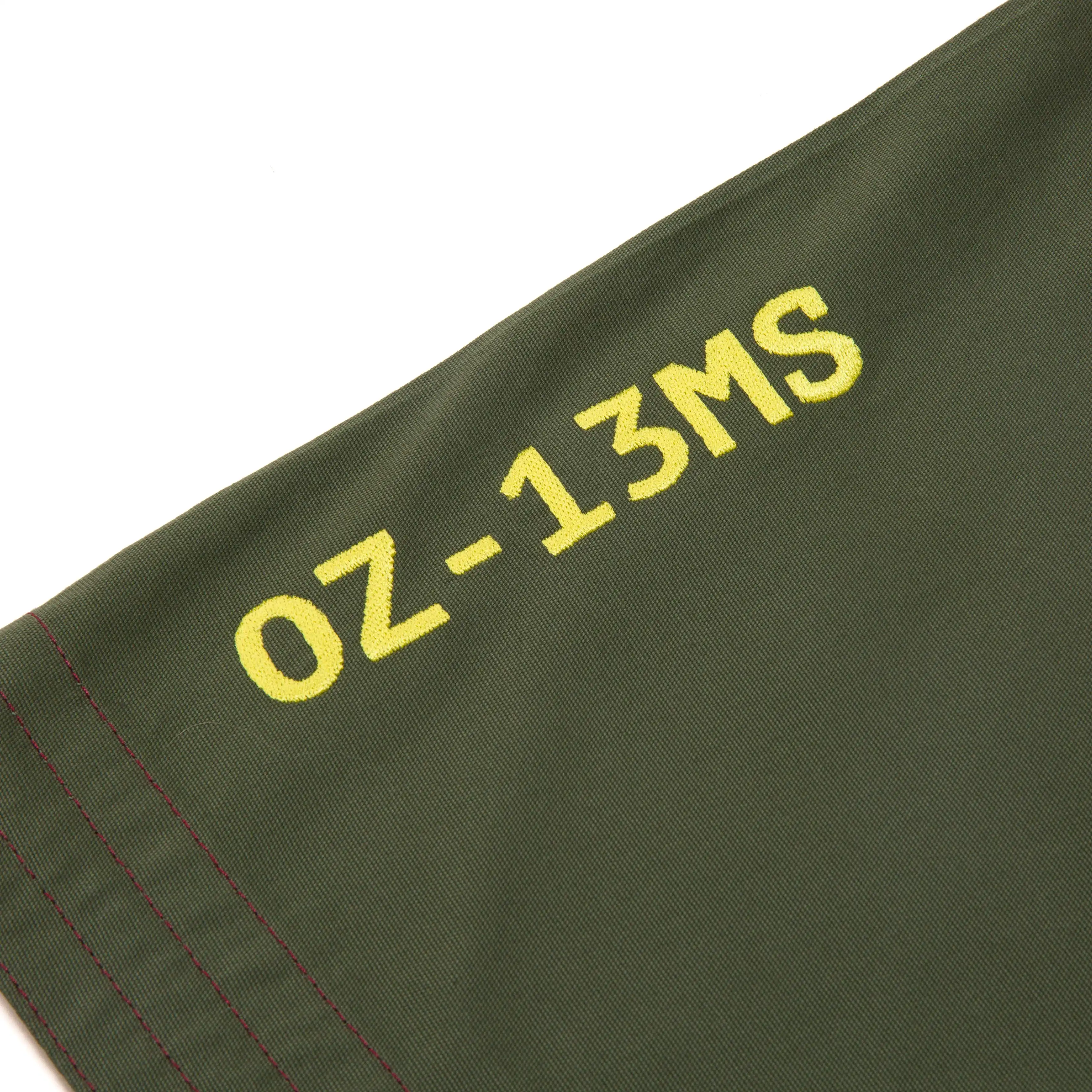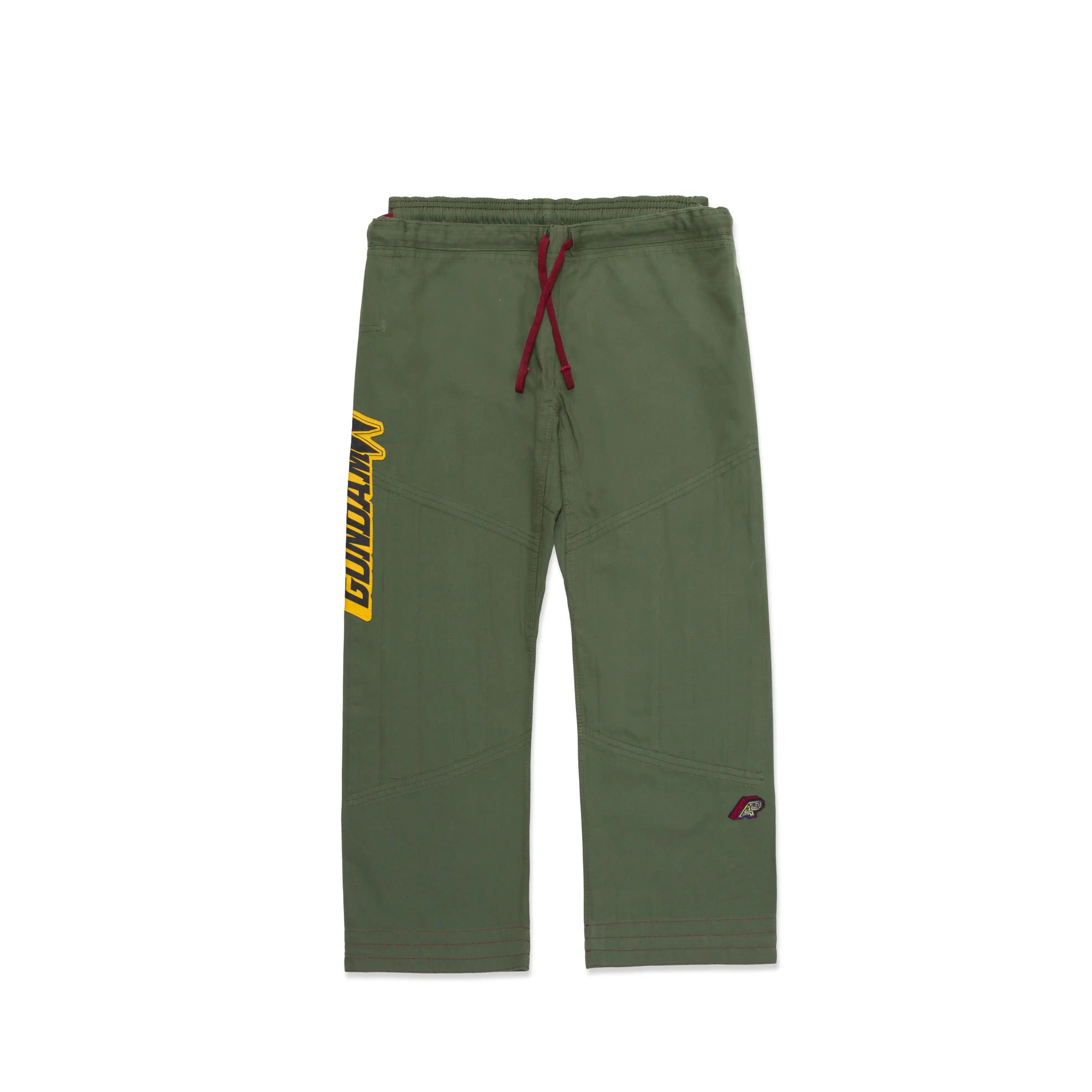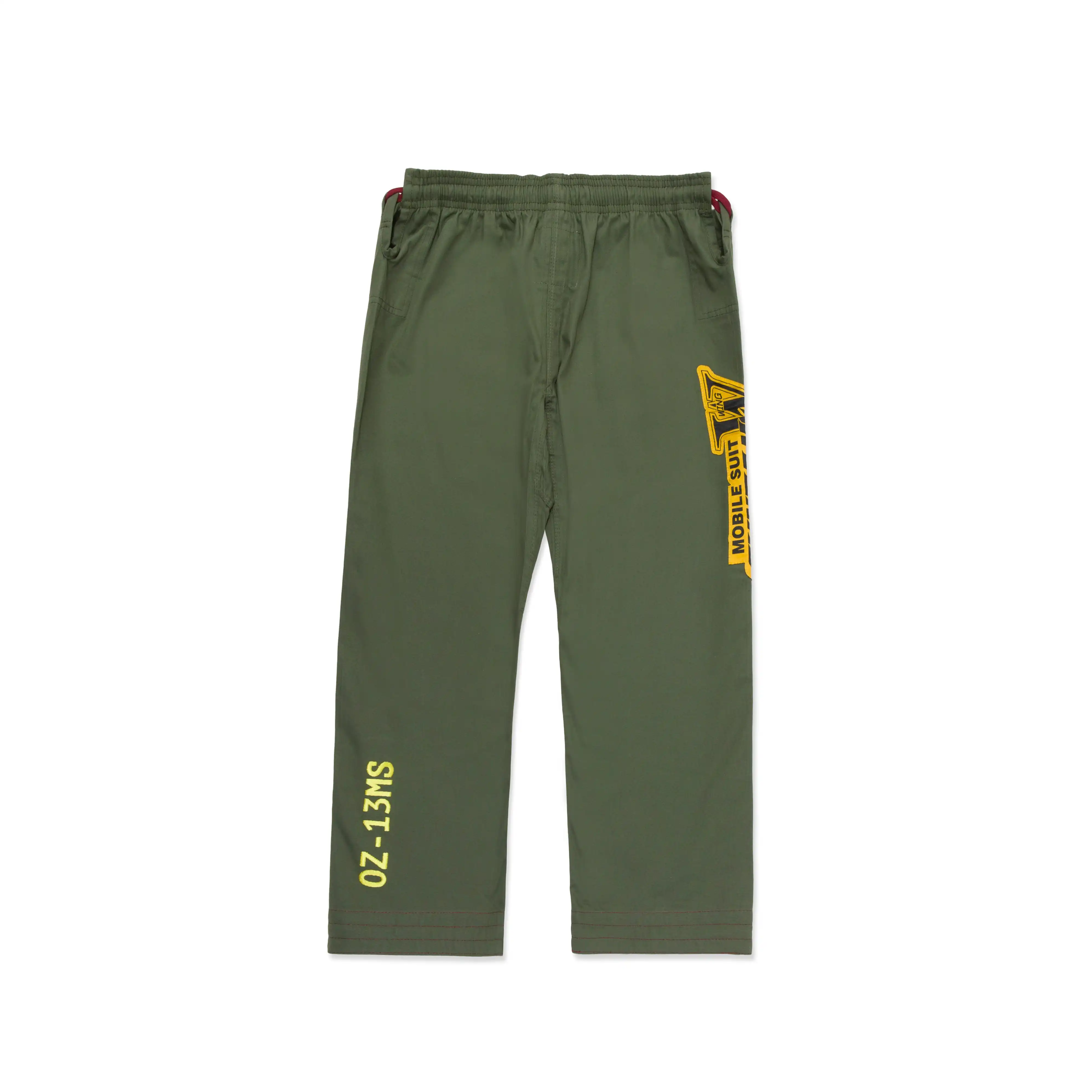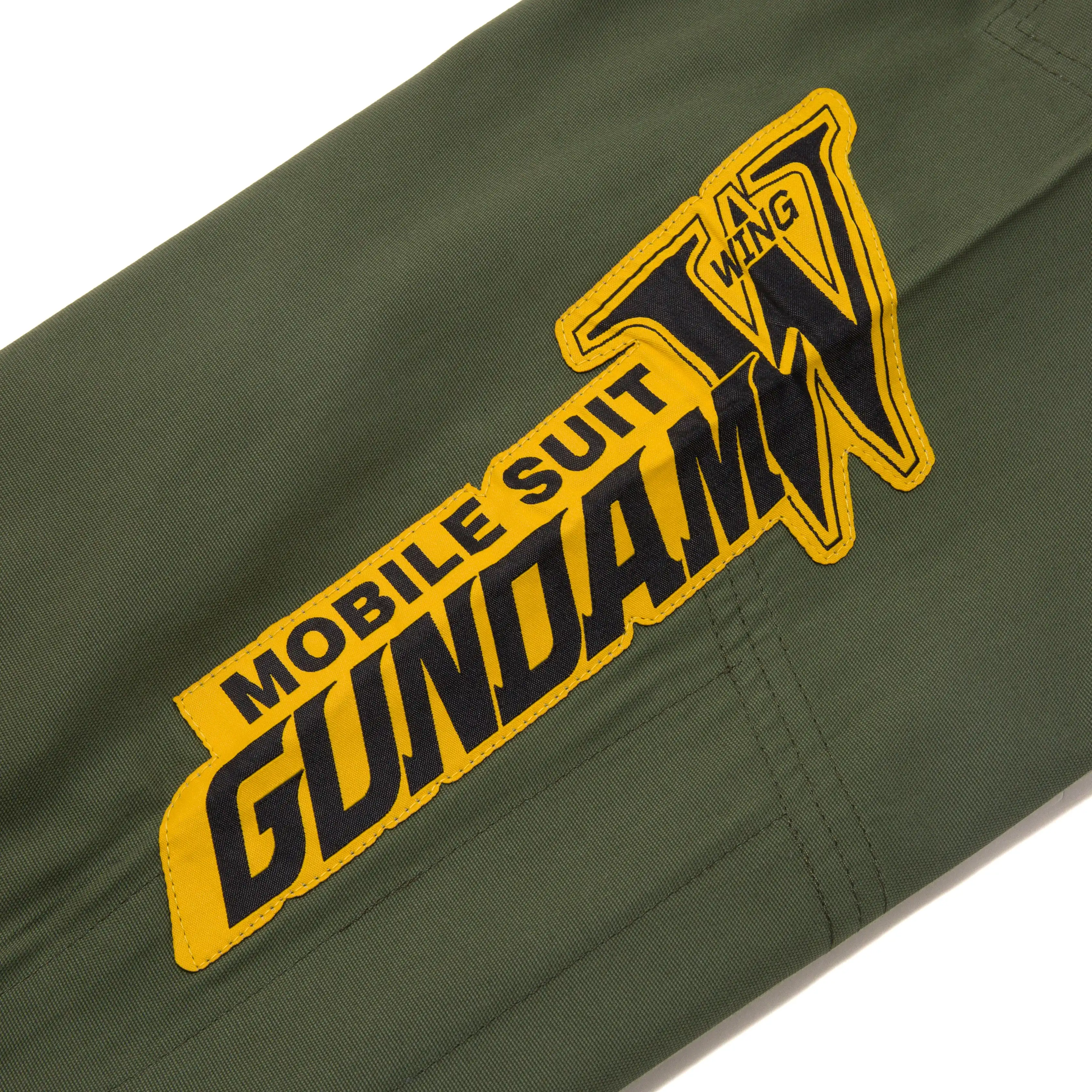 The kimono is paired with A&P’s proprietary canvas novo-pants, which feature matching Mobile Suit Gundam Wing designs. The right leg showcases the title card iconography, while the left ankle exterior boasts embroidered mobile suit serial numbers, completing the ensemble with the A&P logo.