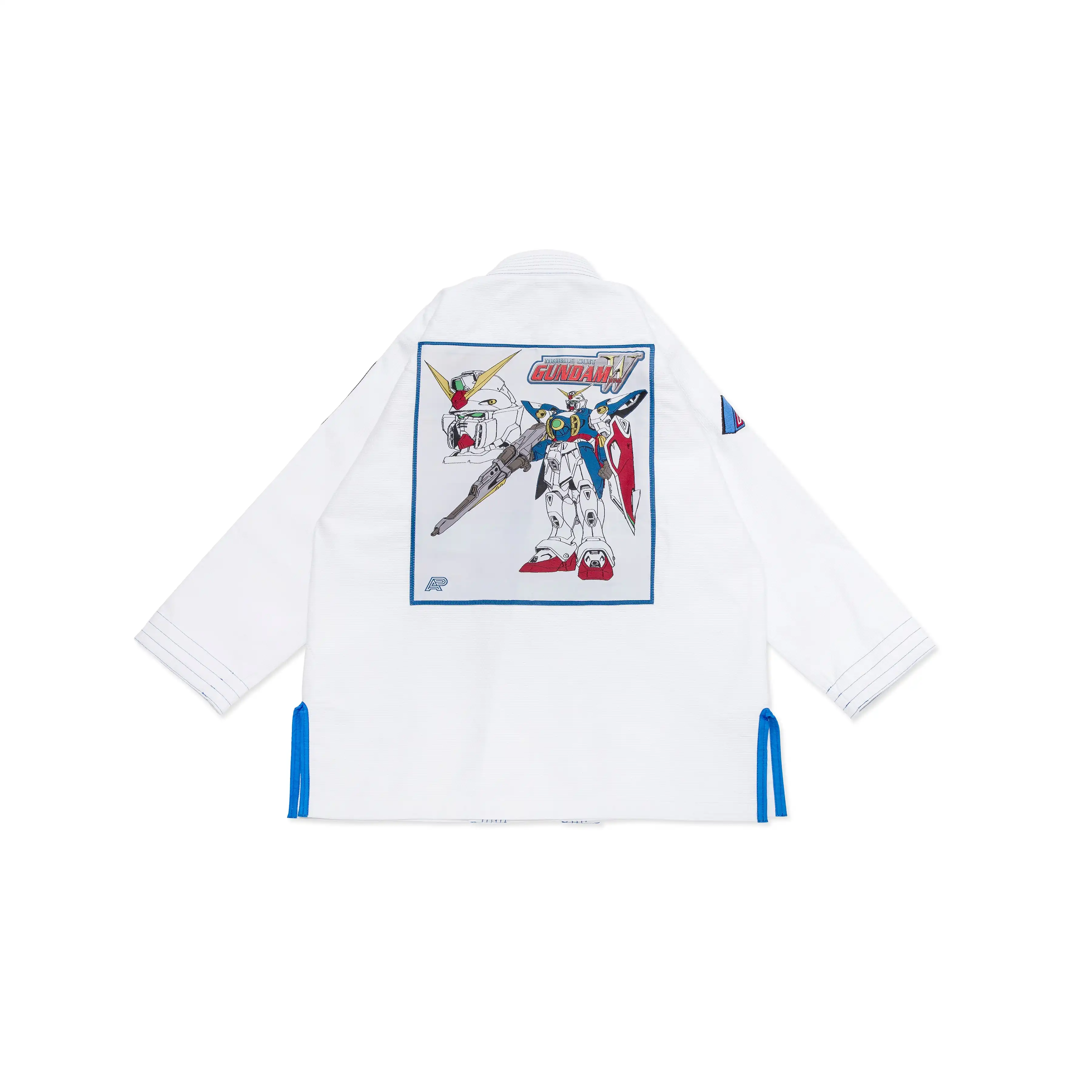 With a unique fusion of martial arts and Mobile Suit Gundam Wing aesthetics, the kimono features Gundam Wing iconography, including embroidered patches on the chest and back. The A&P mark on the right sleeve adds a distinct touch of branding, making it a standout piece.