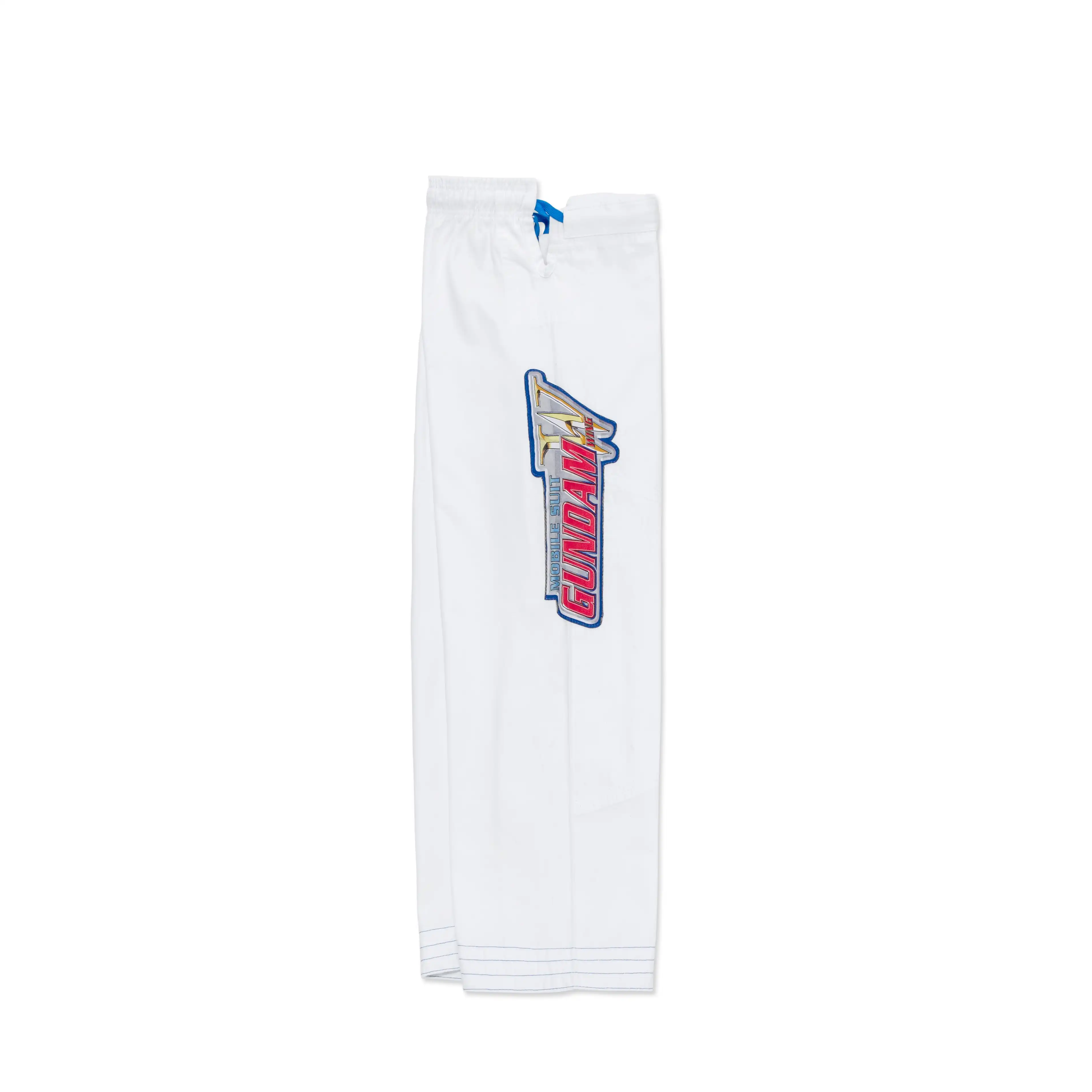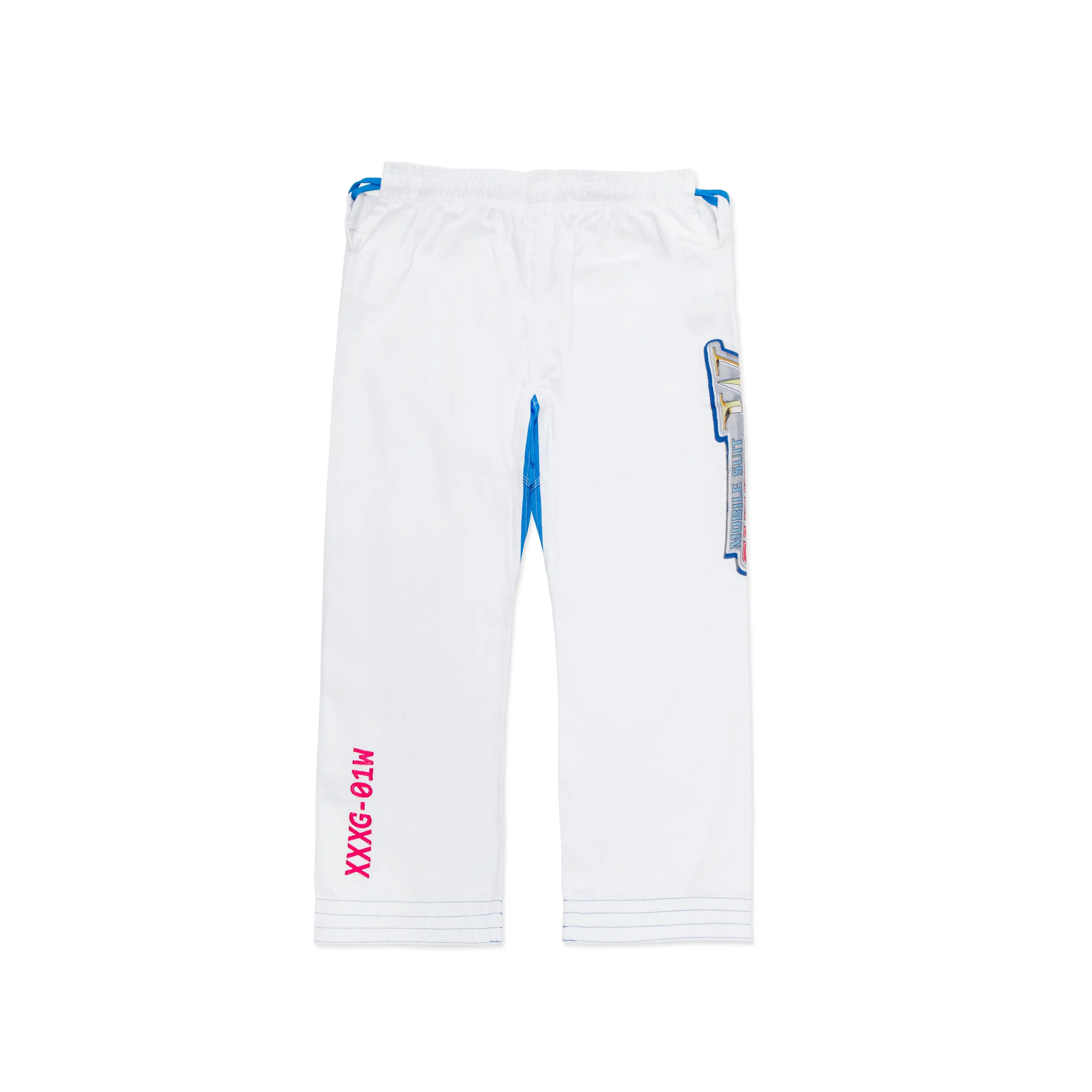 The kimono is paired with A&P’s proprietary canvas novo-pants, which feature matching Mobile Suit Gundam Wing designs. The right leg showcases the title card iconography, while the left ankle exterior boasts embroidered mobile suit serial numbers, completing the ensemble with the A&P logo.