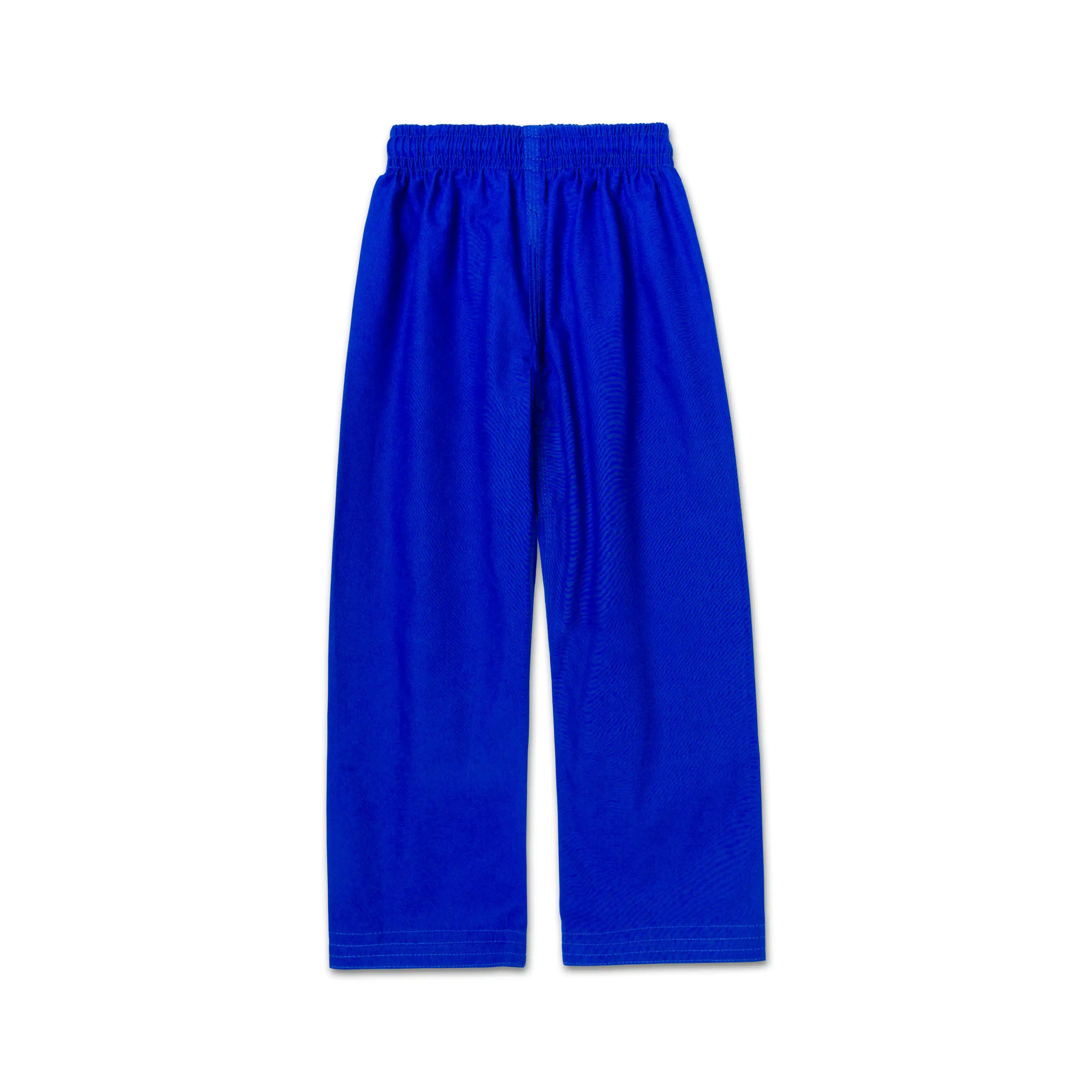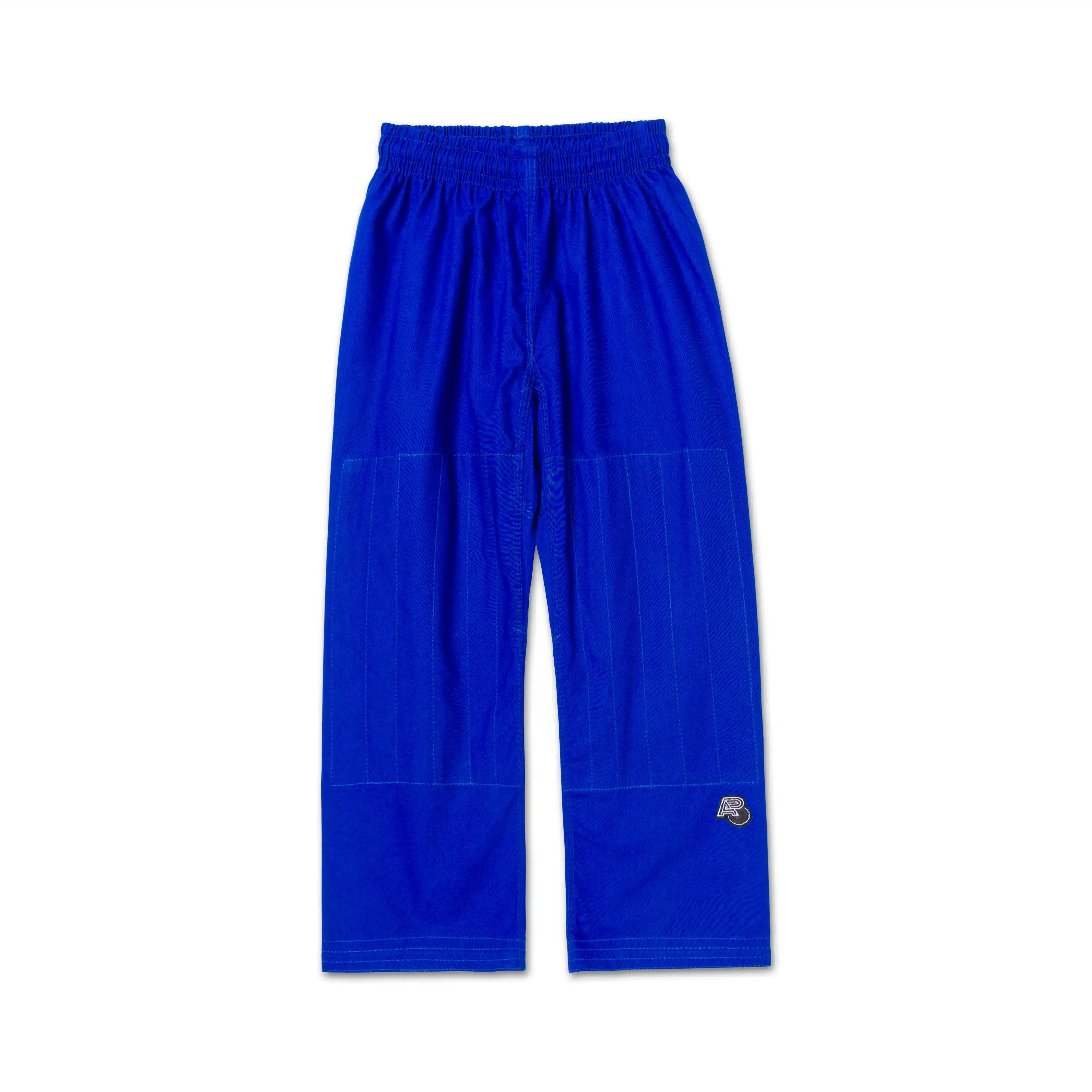 The Albino & Preto Essential Kids BJJ Gi – Blue, 350GSM Pearl Weave (BW) pairs its jacket with 8oz cotton pants that balance light feel and day-to-day durability. At 8oz, the fabric is breathable enough for warm gyms yet sturdy under constant drilling, stand-up entries, and mat scrambles. Parents will appreciate that the pants dry quickly and soften with washing while keeping their structure.