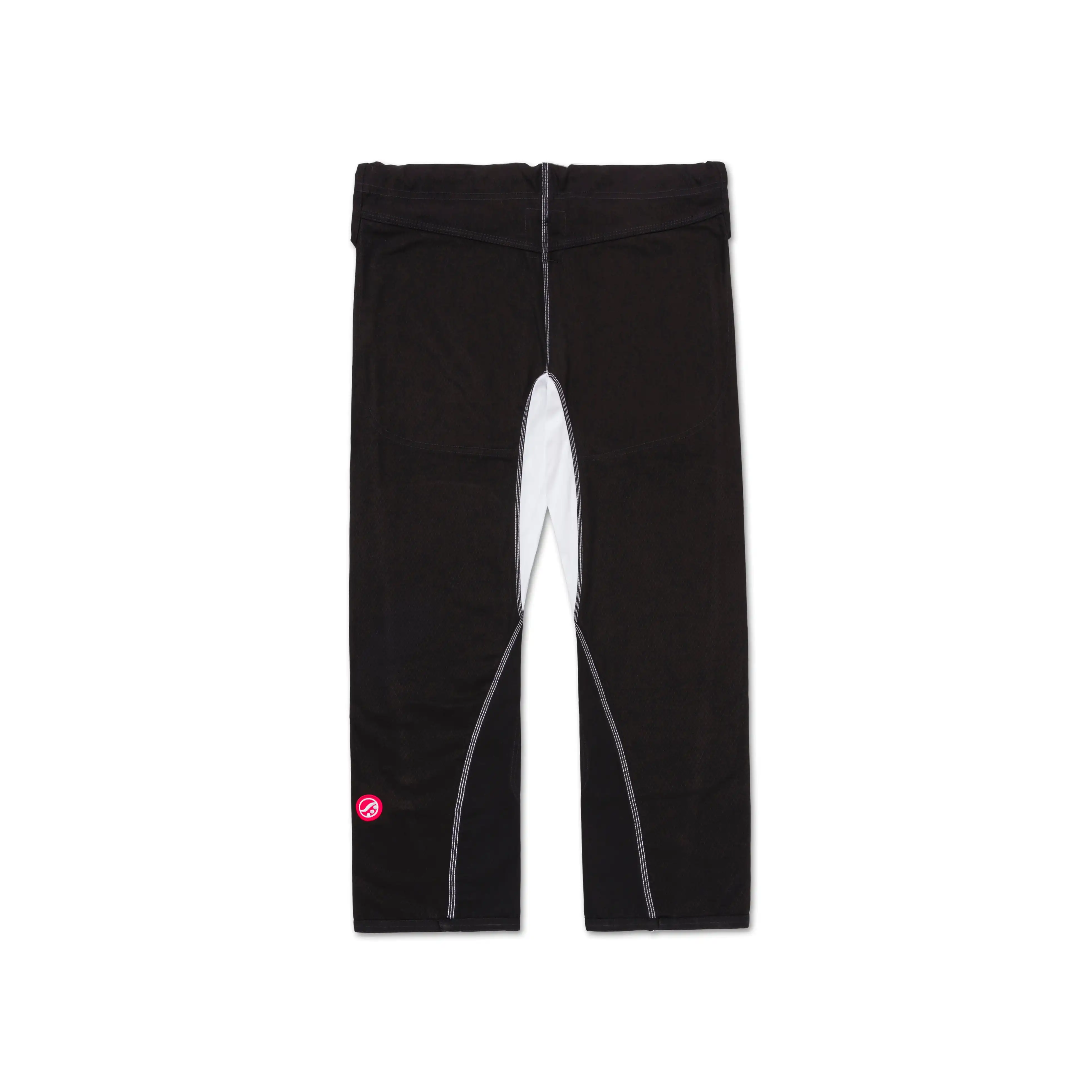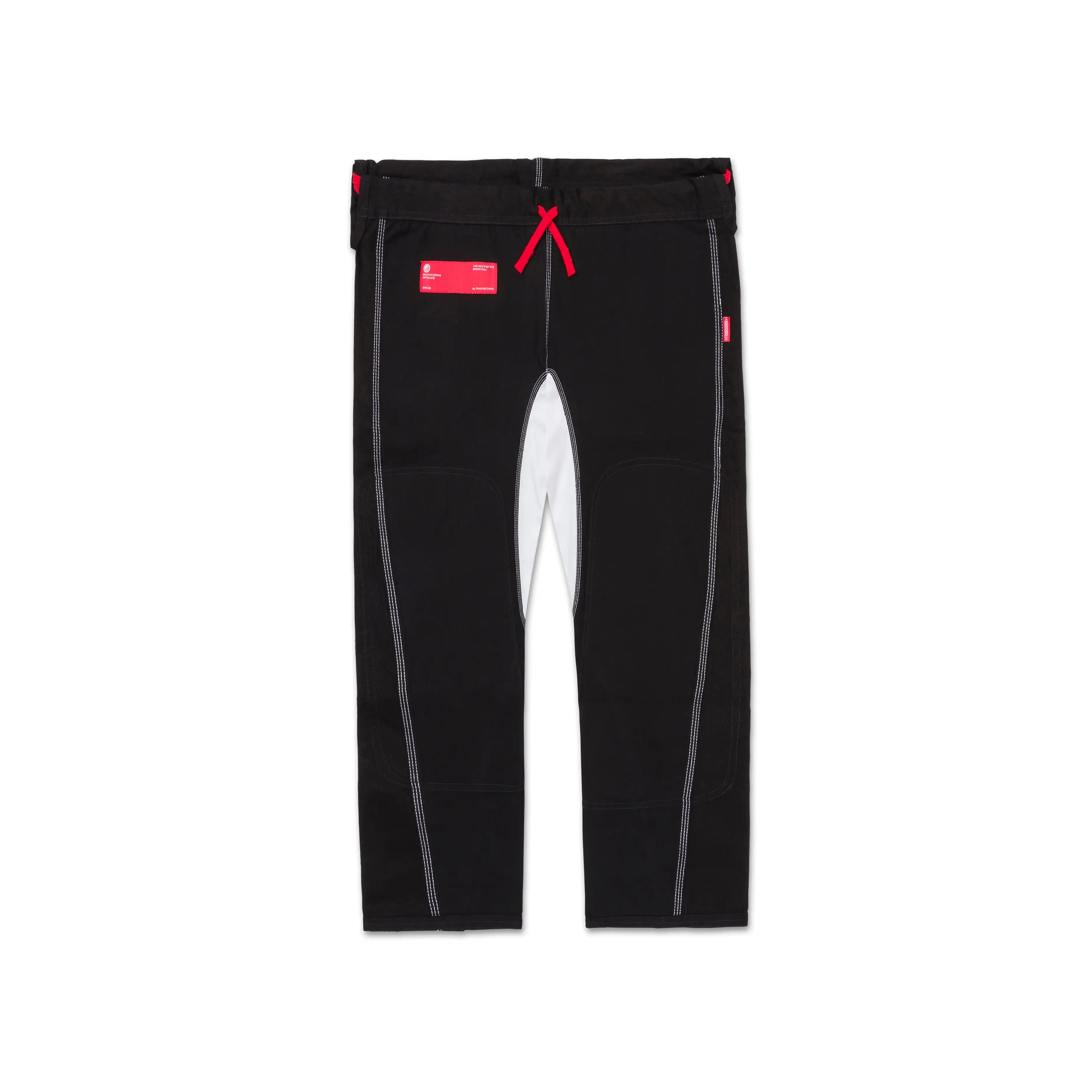 The pants also showcase mixed construction, utilizing 10 oz canvas and 450-gram Judo Weave fabric for a lightweight yet sturdy design. The waistband and inner leg gusset are reinforced, with twisted seams to promote ergonomics and a better fit. Internal reinforcements at the seat ensure long-lasting durability, even during intense grappling sessions.