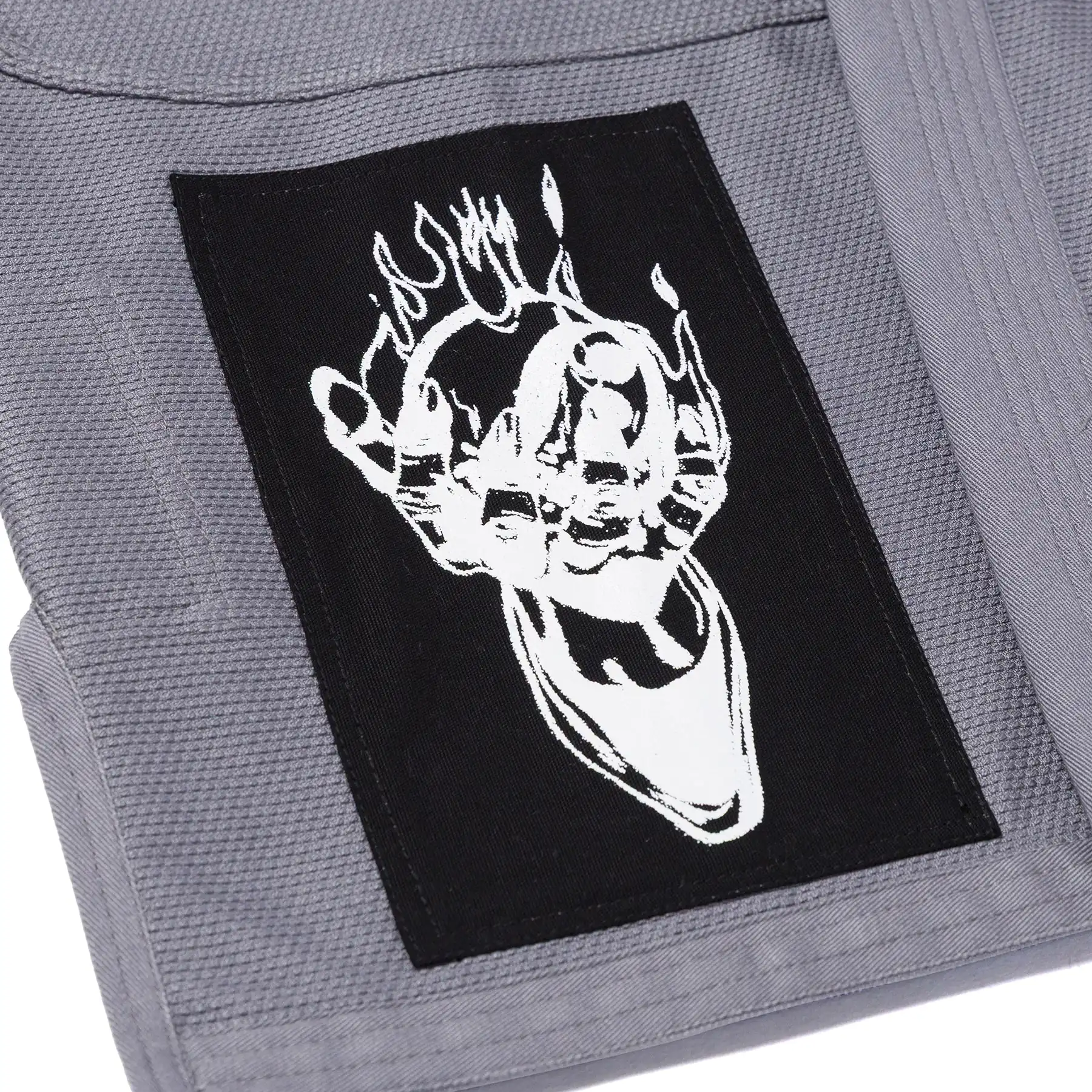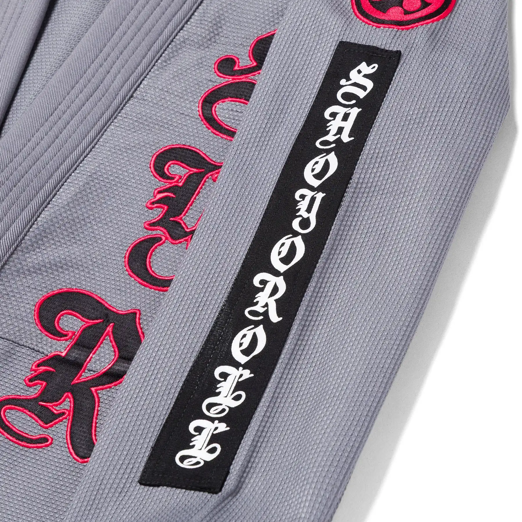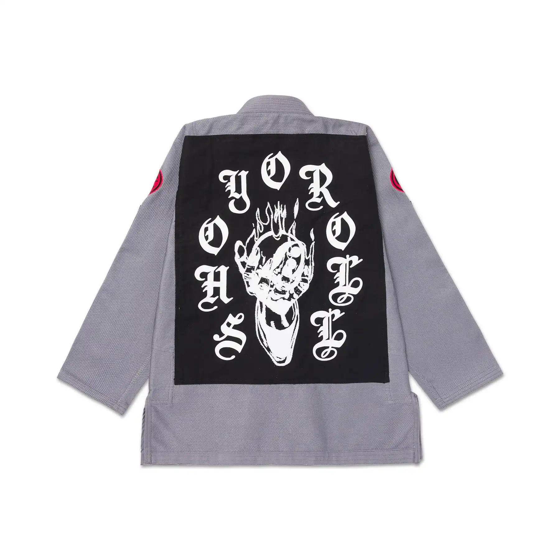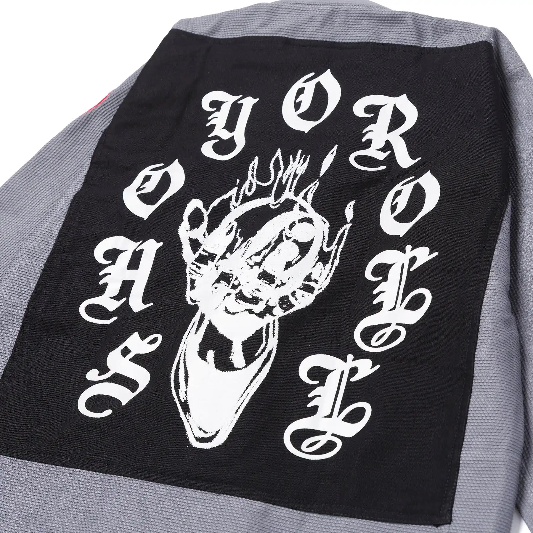 Bold embroidered, patched, and woven details pair with high-contrast iconography and gothic-inspired lettering. Branding is purposeful and lightweight, delivering visual impact while keeping the gi competition-focused.