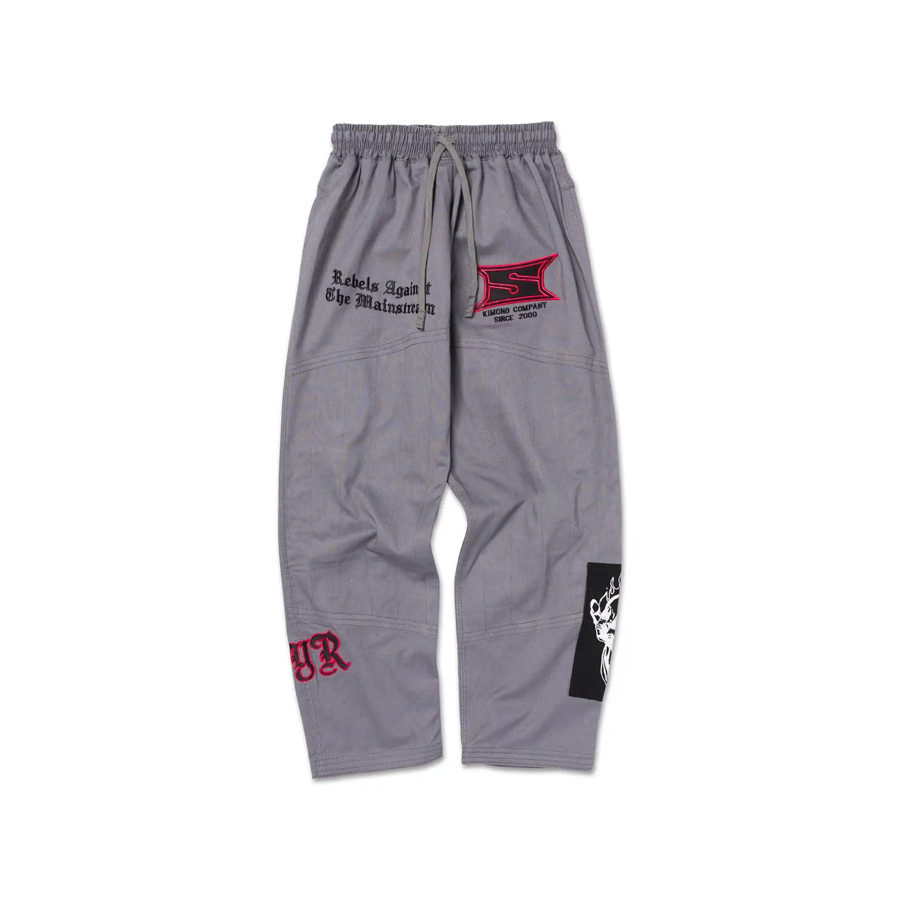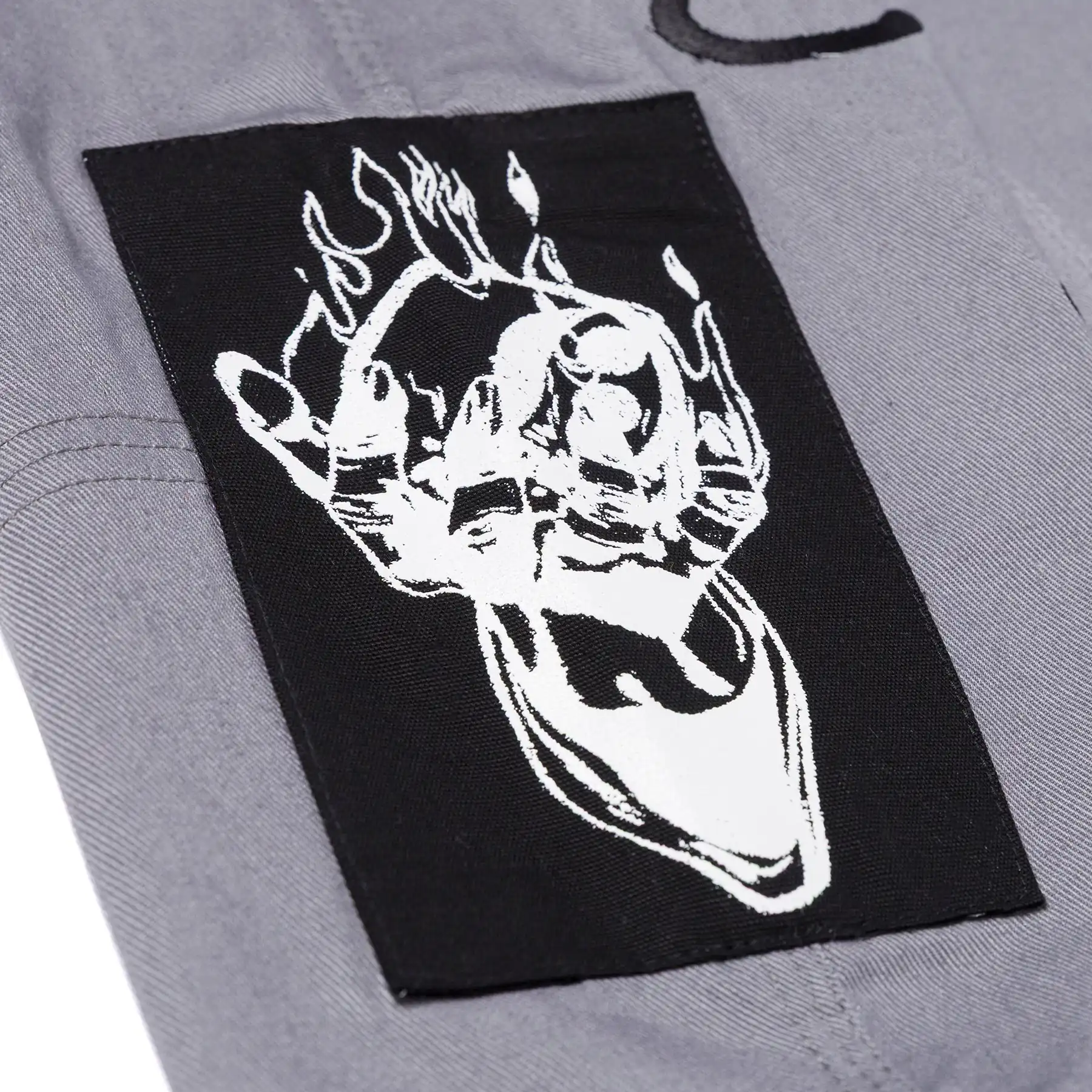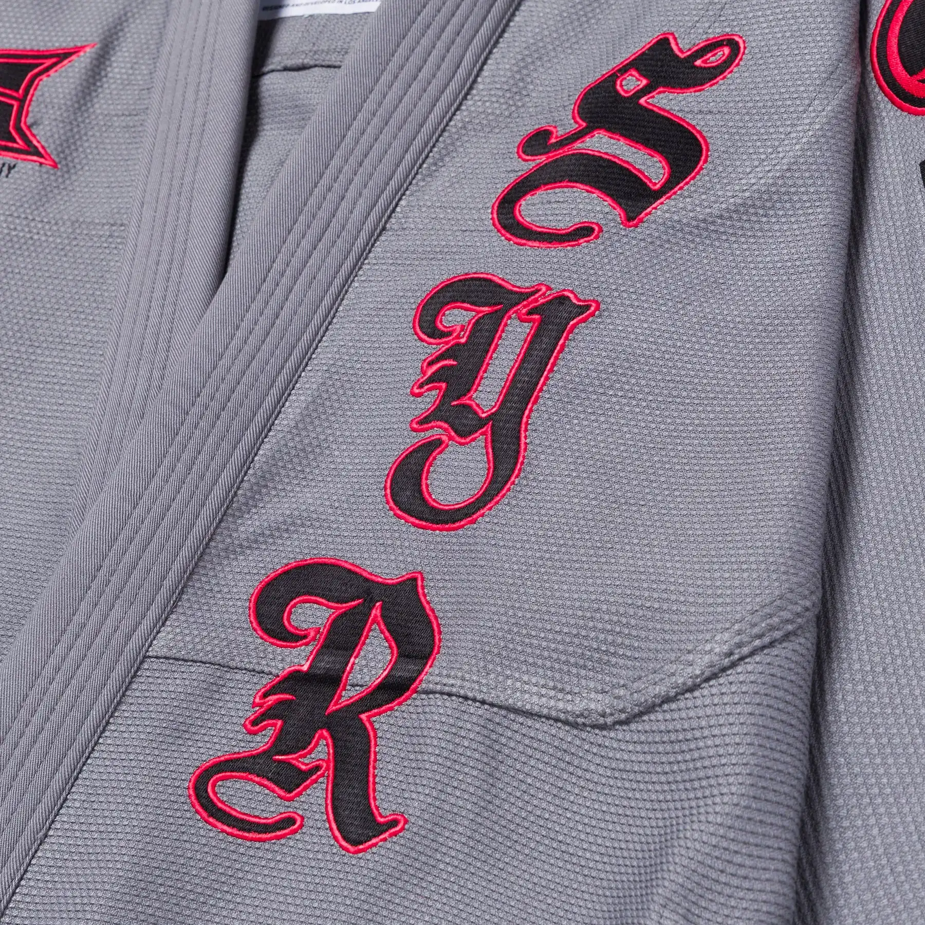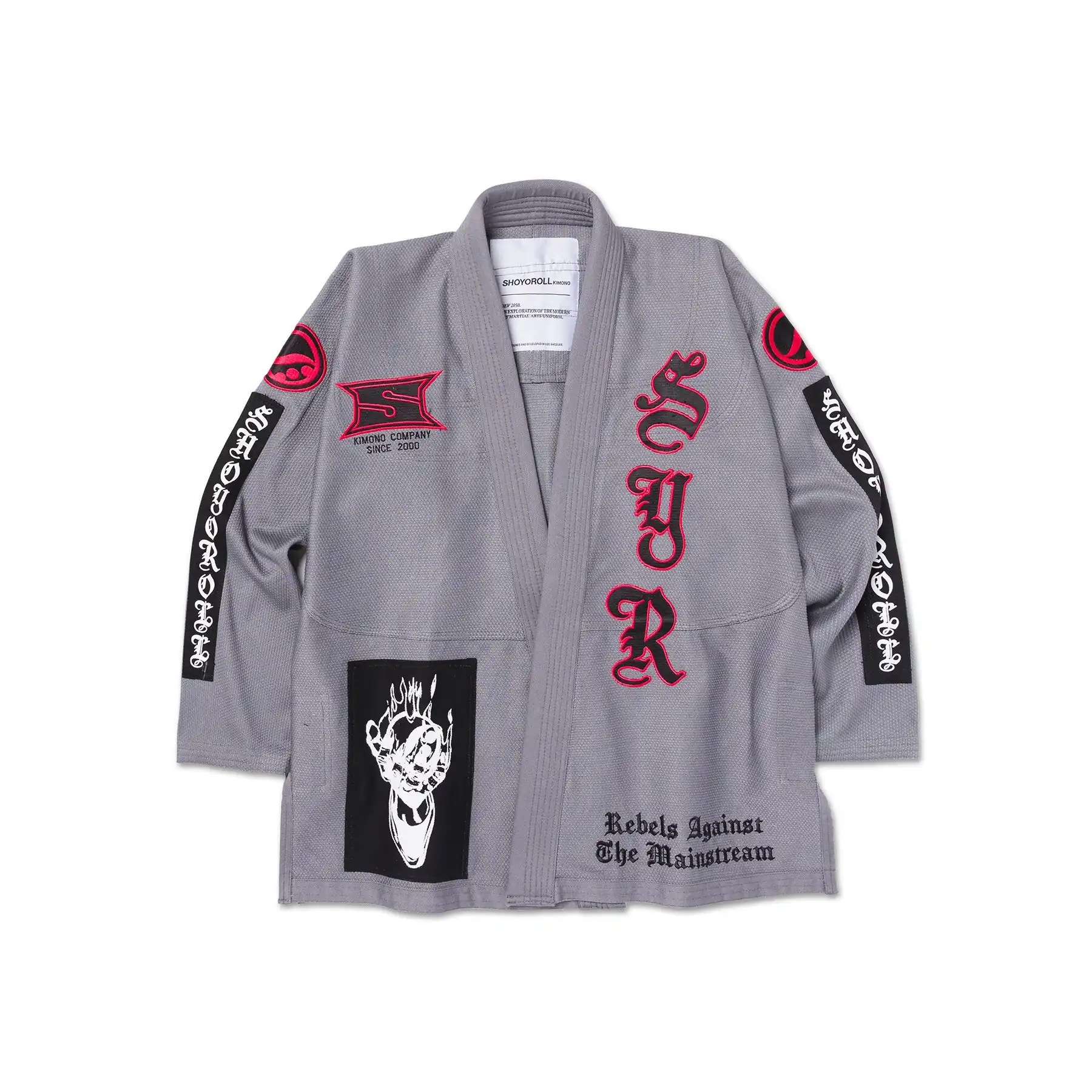Bold embroidered, patched, and woven details pair with high-contrast iconography and gothic-inspired lettering. Branding is purposeful and lightweight, delivering visual impact while keeping the gi competition-focused.
